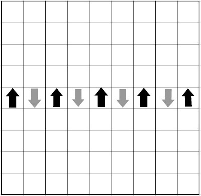 Arrange the 81 blocks in 9 rows each of 9 blocks. The arrows above refer to the direction of the final seam allowances of the individual blocks in Step 6. (For example, the final seams of all blocks in the first vertical column should be pressed up). By alternating the direction of the final seam allowance all of the other seam allowances will also "lock" together and will make matching of seams a piece o' cake.